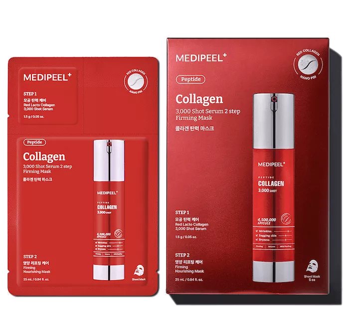The MEDI-PEEL Red Lacto Collagen 3000 Shot Serum 2 Step Mask is a professional-grade, dual-step treatment mask designed to deliver firming, lifting, and deep hydration benefits. Enriched with high-concentration collagen and probiotics, it revitalizes tired, sagging skin while reinforcing the skin barrier for a plump, radiant, youthful look.