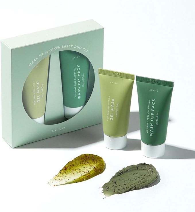 AXIS-Y Mask Now Glow Later Duo Set is a 2-step masking routine designed to detoxify, clarify, and instantly boost skin radiance. This dual mask set combines the purifying power of the Mugwort Pore Clarifying Wash Off Pack and the nourishing hydration of the New Skin Resolution Gel Mask to help you achieve clean, calm, and glowing skin — both instantly and over time.