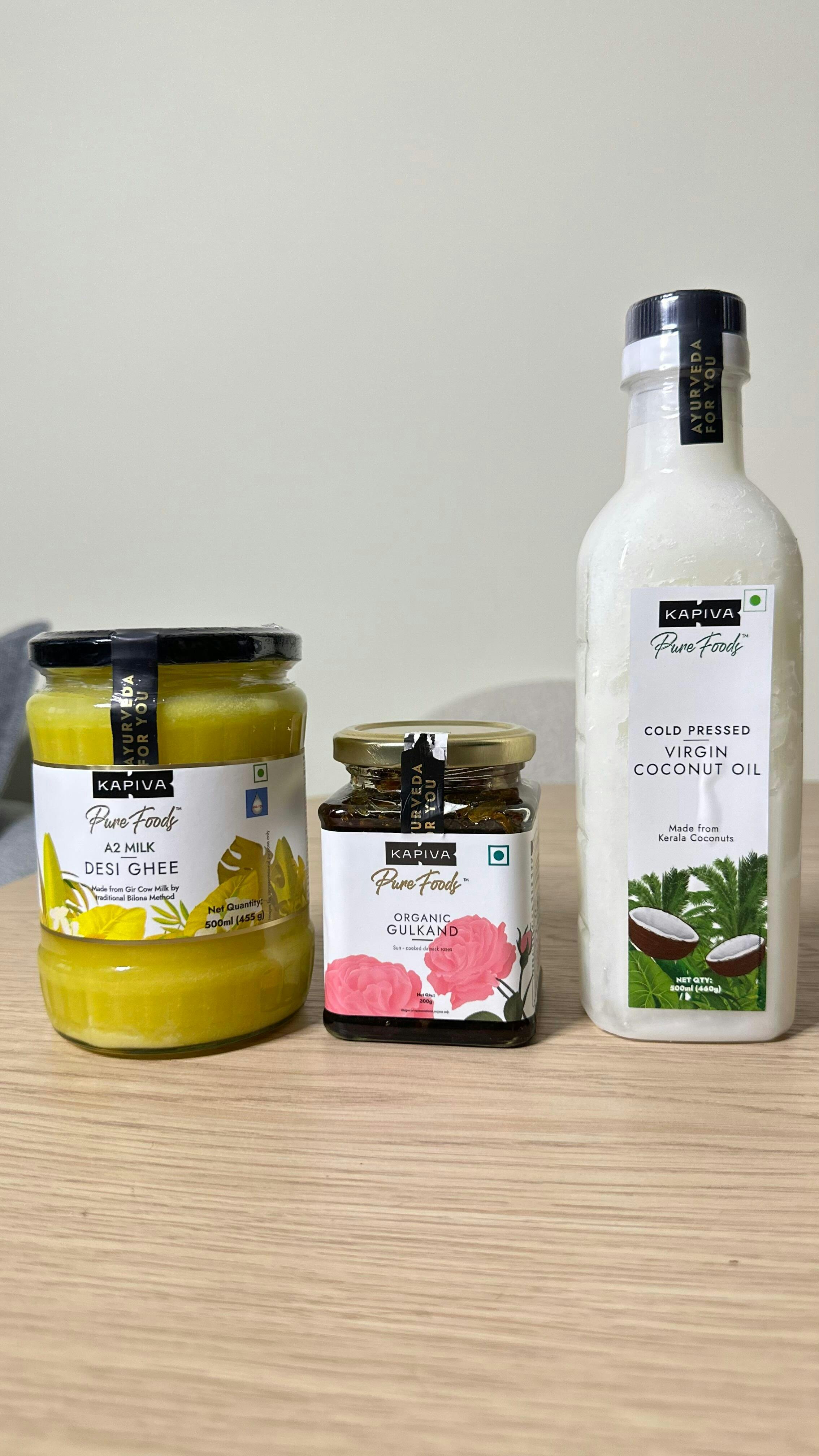Kapiva Wellness Superfood Combo – Kapiva Organic Gulkand 300g + A2 Cow Desi Ghee 500ml (455g) + Kerala Virgin Coconut Oil 500ml