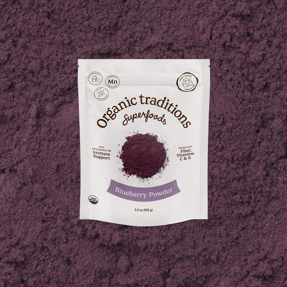 Organic Traditions Blueberry Powder is a premium, nutrient-dense superfood made from 100% pure, organic wild blueberries. This finely milled powder preserves the natural flavor, color, and antioxidants of fresh blueberries, offering a convenient way to boost your daily nutrition. Perfect for smoothies, yogurt, oatmeal, or baking, it provides a delicious dose of polyphenols, fiber, and vitamins for overall wellness.