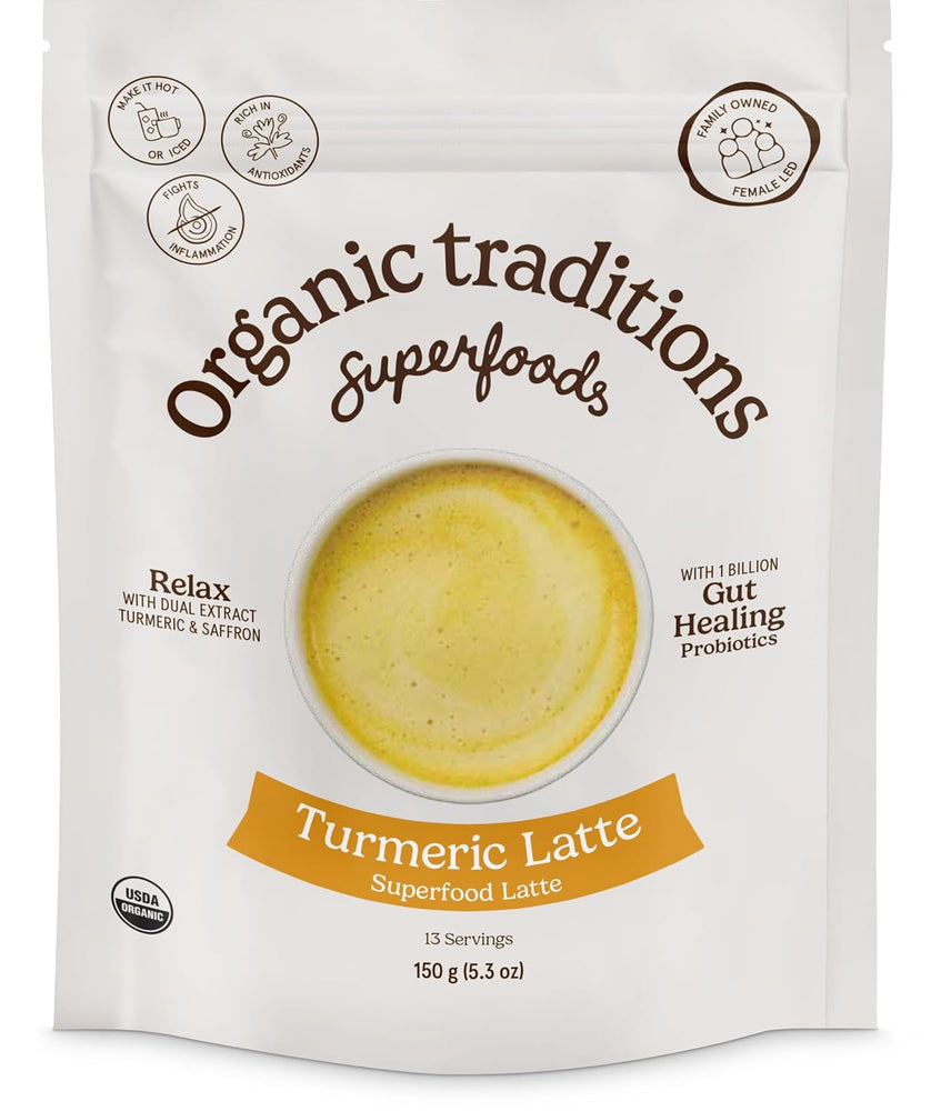 Organic Traditions Turmeric Latte with Saffron & Probiotics is a nourishing and aromatic superfood blend crafted to support wellness from within. This vibrant golden latte combines turmeric, saffron, and warming spices with plant-based probiotics, creating a soothing beverage that promotes digestive health, immunity, and overall vitality. Enjoy it as a comforting, caffeine-free alternative to coffee — perfect for morning rituals or evening relaxation.